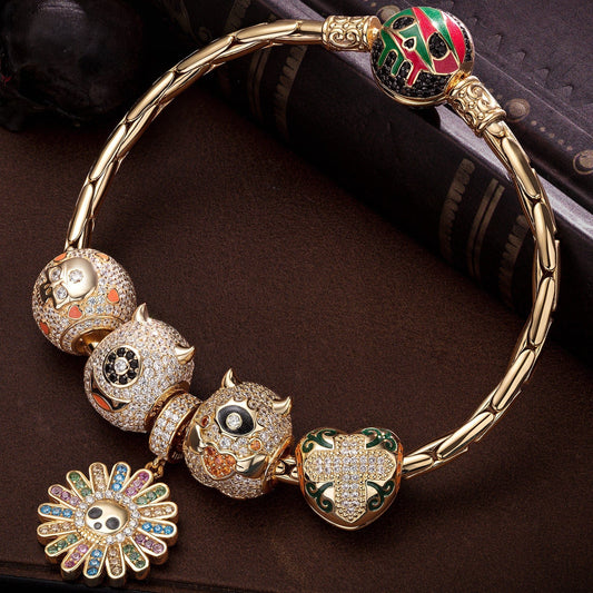 Sterling Silver Halloween Monster Family Charms Bracelet Set With Enamel In 14K Gold Plated (Includes bracelet and all charms shown)