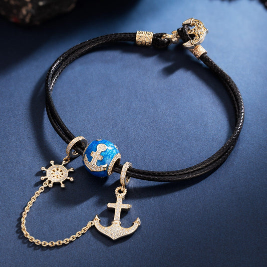 Boat Anchor Tarnish-resistant Silver Leather Charms Bracelet Set With Enamel In 14K Gold Plated (Includes bracelet and all charms shown)