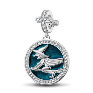 Sterling Silver Witch On Broom Dangle Charms With Enamel In White Gold Plated