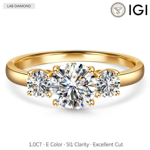 IGI Certified Lab-Grown Round Brilliant Cut Diamond - Three Stone Classic Engagement Ring 14K Yellow Gold Plated (Includes IGI Certification from International Gemological Institute)