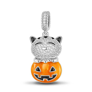 Sterling Silver Cute Pumpkin Cat Dangle Charms With Enamel In White Gold Plated