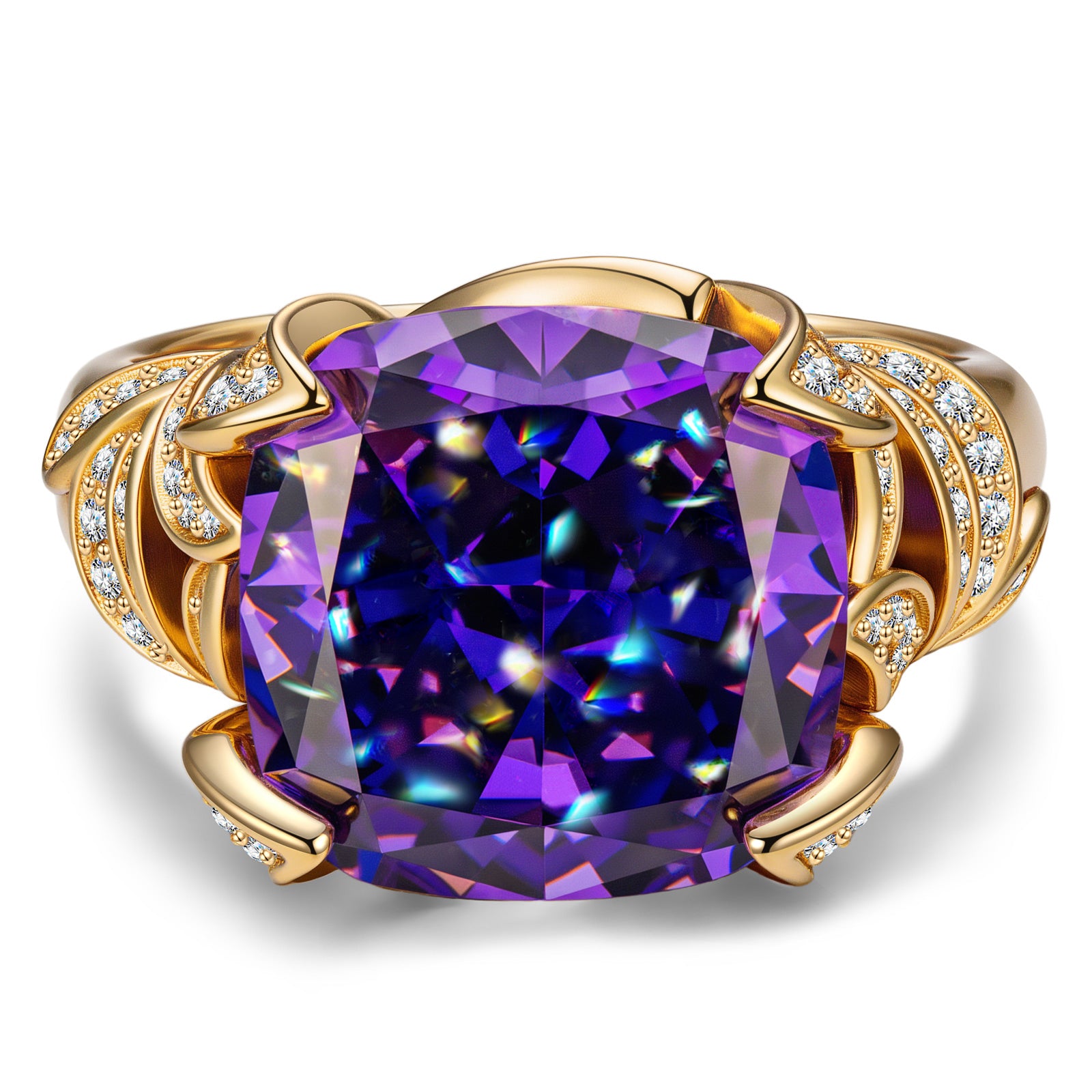 12*12mm Cushion Modified Brilliant Cut Fancy Vivid Violet Hue Ice-Frosted Sparkle Lab Zircon - Pave Classic Engagement Ring 14K Yellow Gold Plated