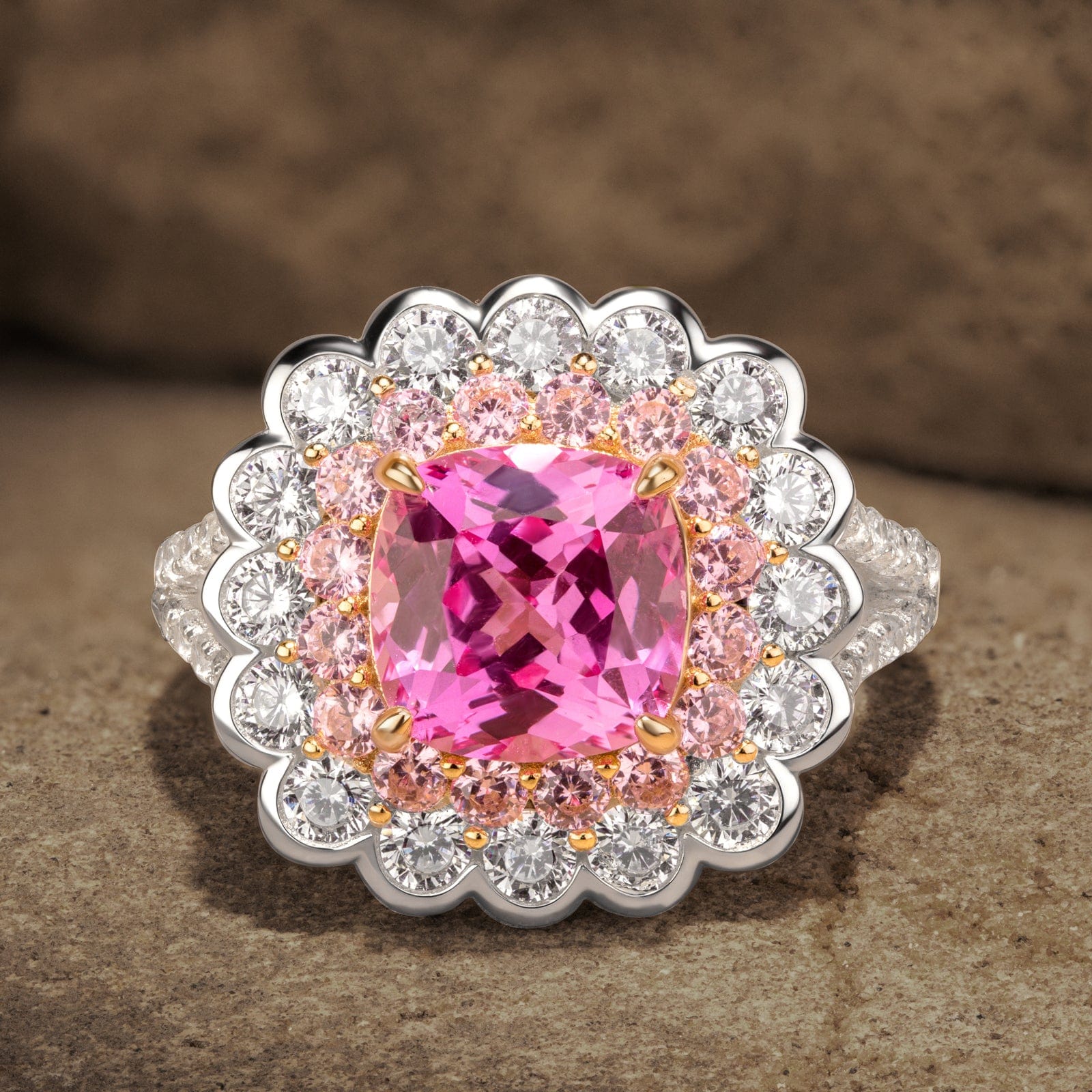 Cushion Cut Fancy Vivid Rose Hue Lab-Certified Pink Sapphire - Halo Classic Engagement Ring Two-Tone Plating (Includes GRC Certification from Gemstone Research Center)