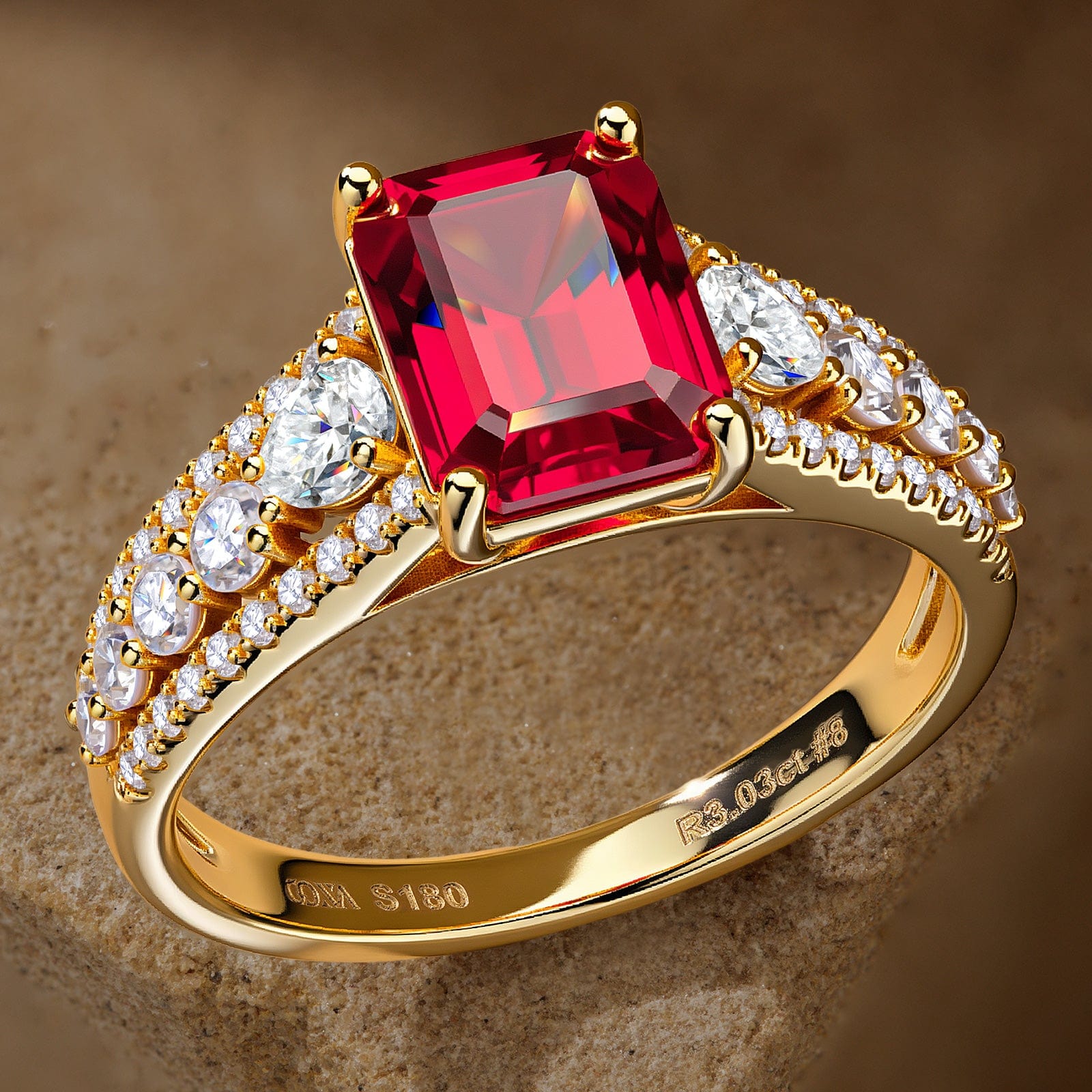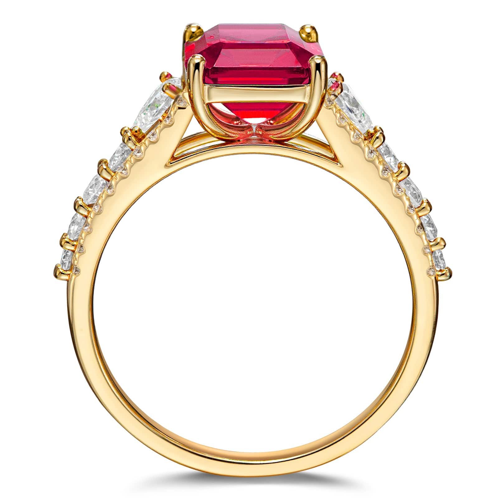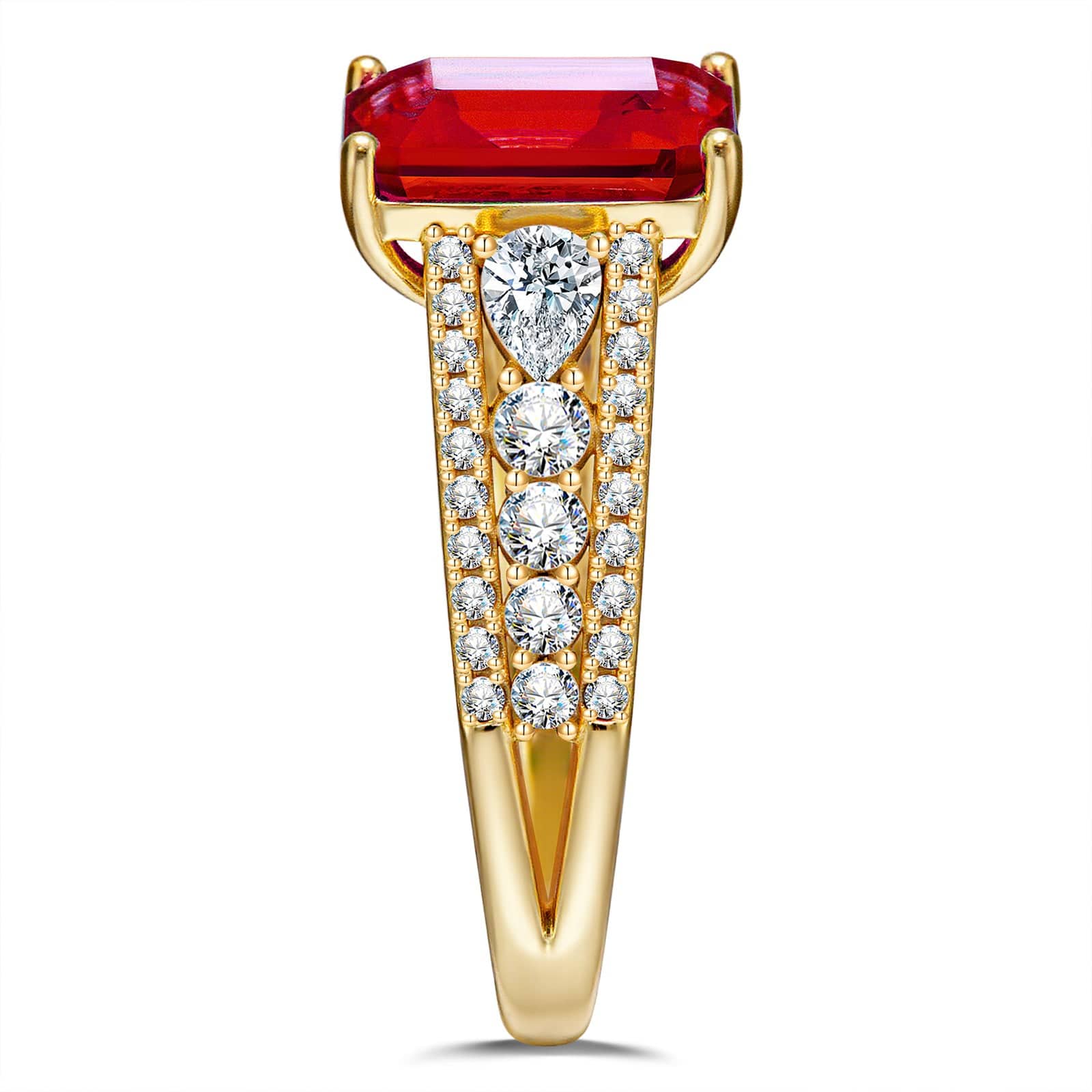 Emerald-Cut Vivid Pigeon Blood Red Lab-Certified Ruby - Pave Classic Engagement Ring 14K Yellow Gold Plated (Includes GRC Certification from Gemstone Research Center)