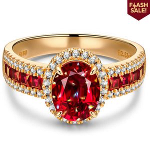 Oval Brilliant Cut Vivid Pigeon Blood Red Lab-Certified Ruby - Halo Classic Engagement Ring 14K Yellow Gold Plated (Includes GRC Certification from Gemstone Research Center)