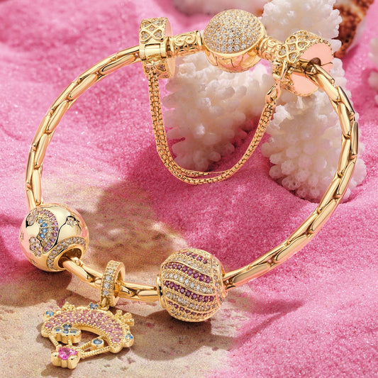 Sterling Silver Pink Sky Adventures Charms Bracelet Set In 14K Gold Plated (Includes bracelet and all charms shown)