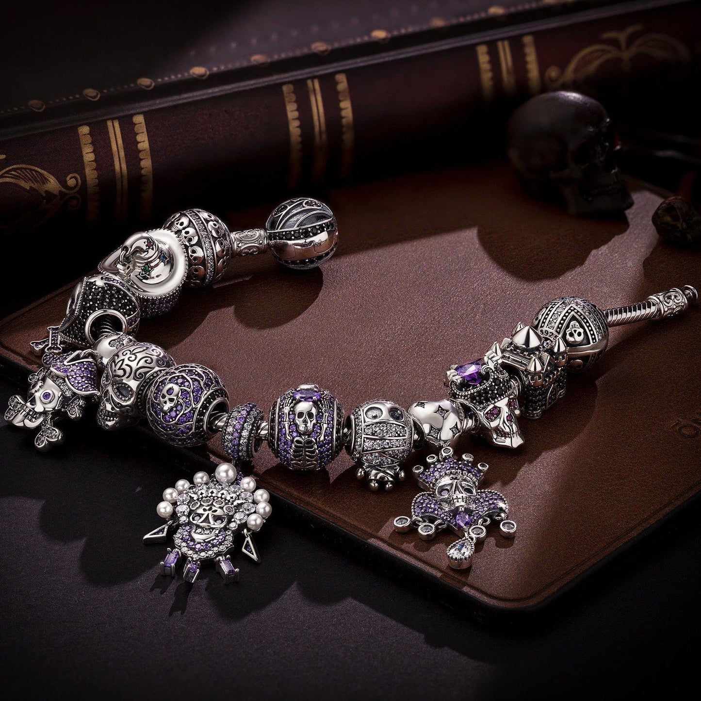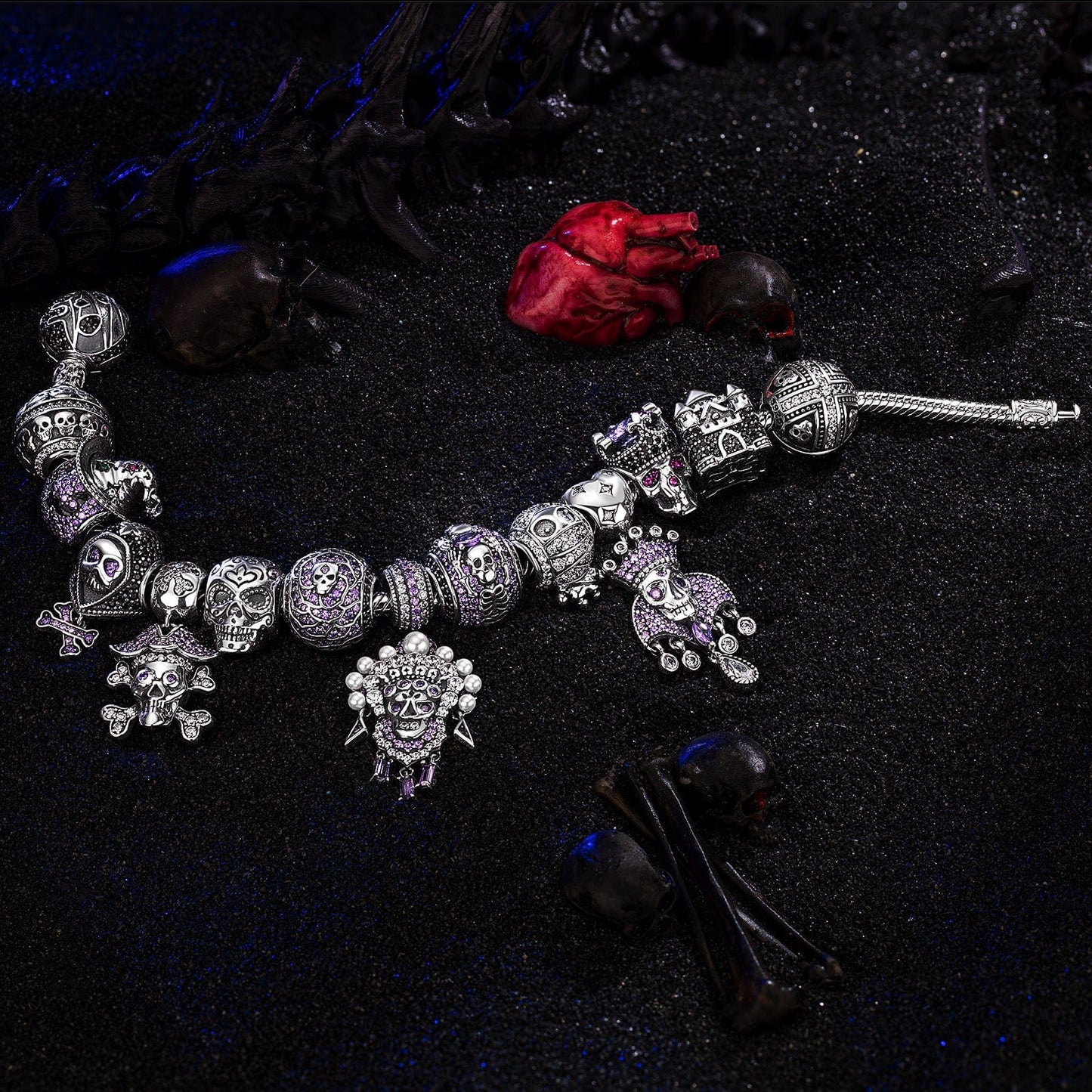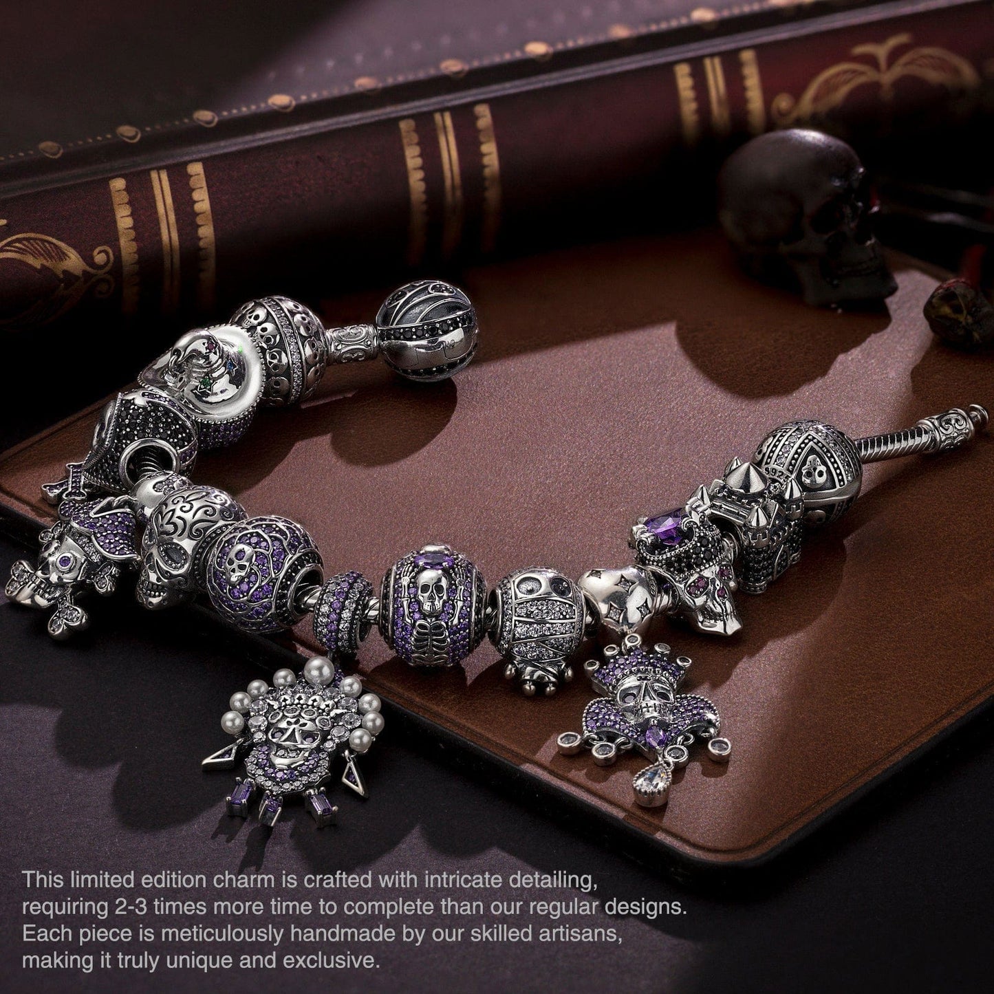 Limited Edition Flash Sale: Sterling Silver Shadowed Skull Kingdom Charms Bracelet Set With Enamel In White Gold Plated (Includes bracelet and all charms shown)