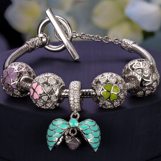 Sterling Silver Colorful Clover Charms Bracelet Set With Enamel In White Gold Plated (Includes bracelet and all charms shown)
