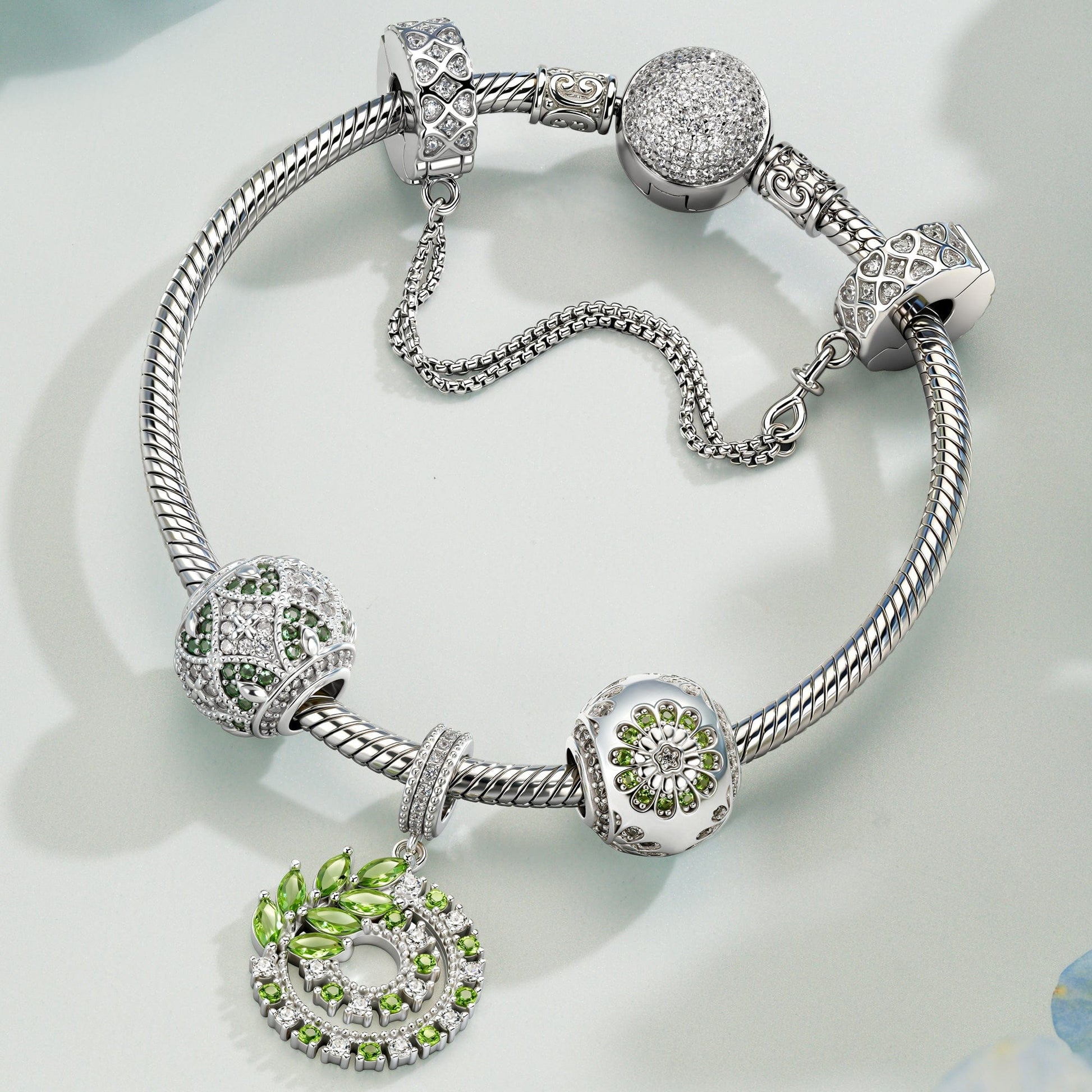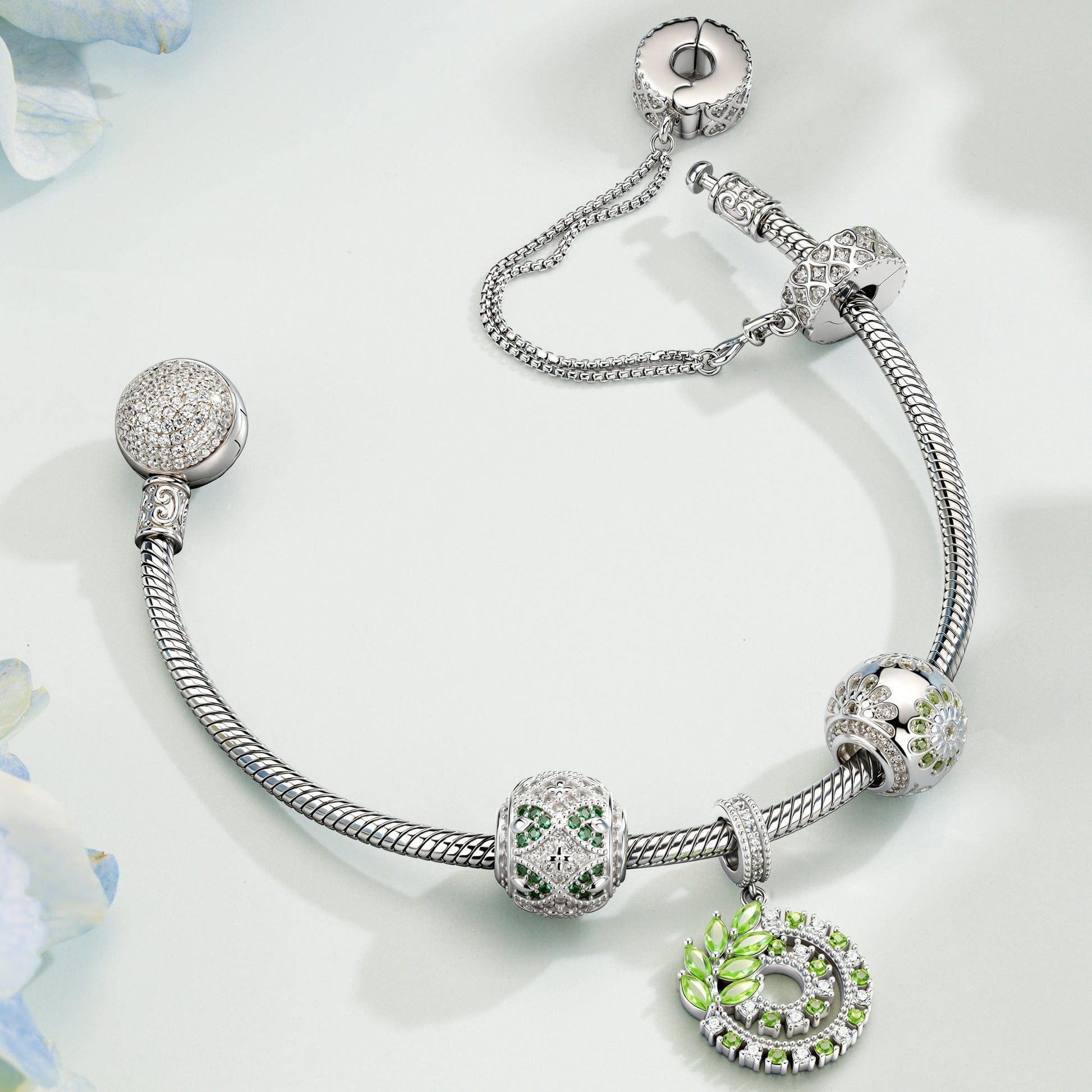 Sterling Silver Fluttering Leaf Charms Bracelet Set In White Gold Plated (Includes bracelet and all charms shown)