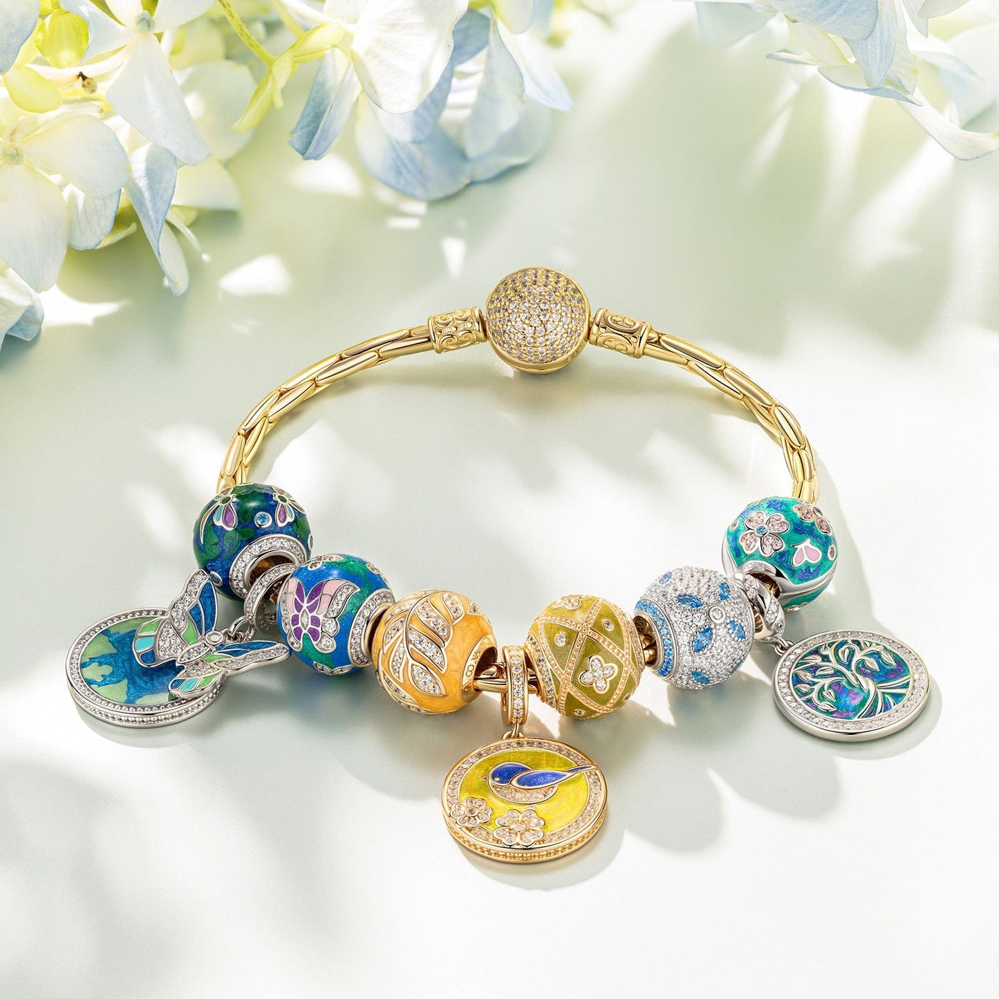 Design: Morning After Rain.With a nod to the lush landscapes of the Emerald City which capture the essence of the magical journey. Featuring delicate butterfly, vibrant parrot, blooming flowers and lush leaves, these charms are meticulously crafted with fine attention to detail. Each piece symbolize the vibrant hues of spring. Let these charming pieces transport you to a world of wonder and delight.