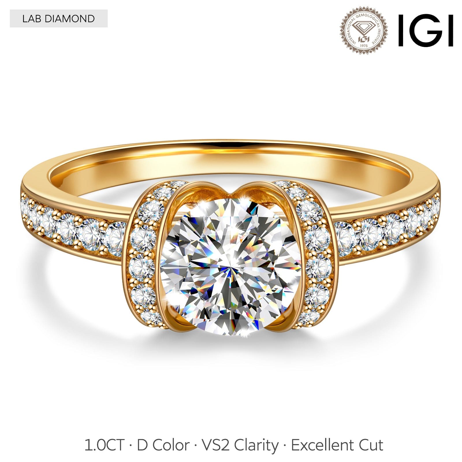 IGI Certified Lab-Grown Round Brilliant Cut Diamond - Halo Classic Engagement Ring 14K Yellow Gold Plated (Includes IGI Certification from International Gemological Institute)