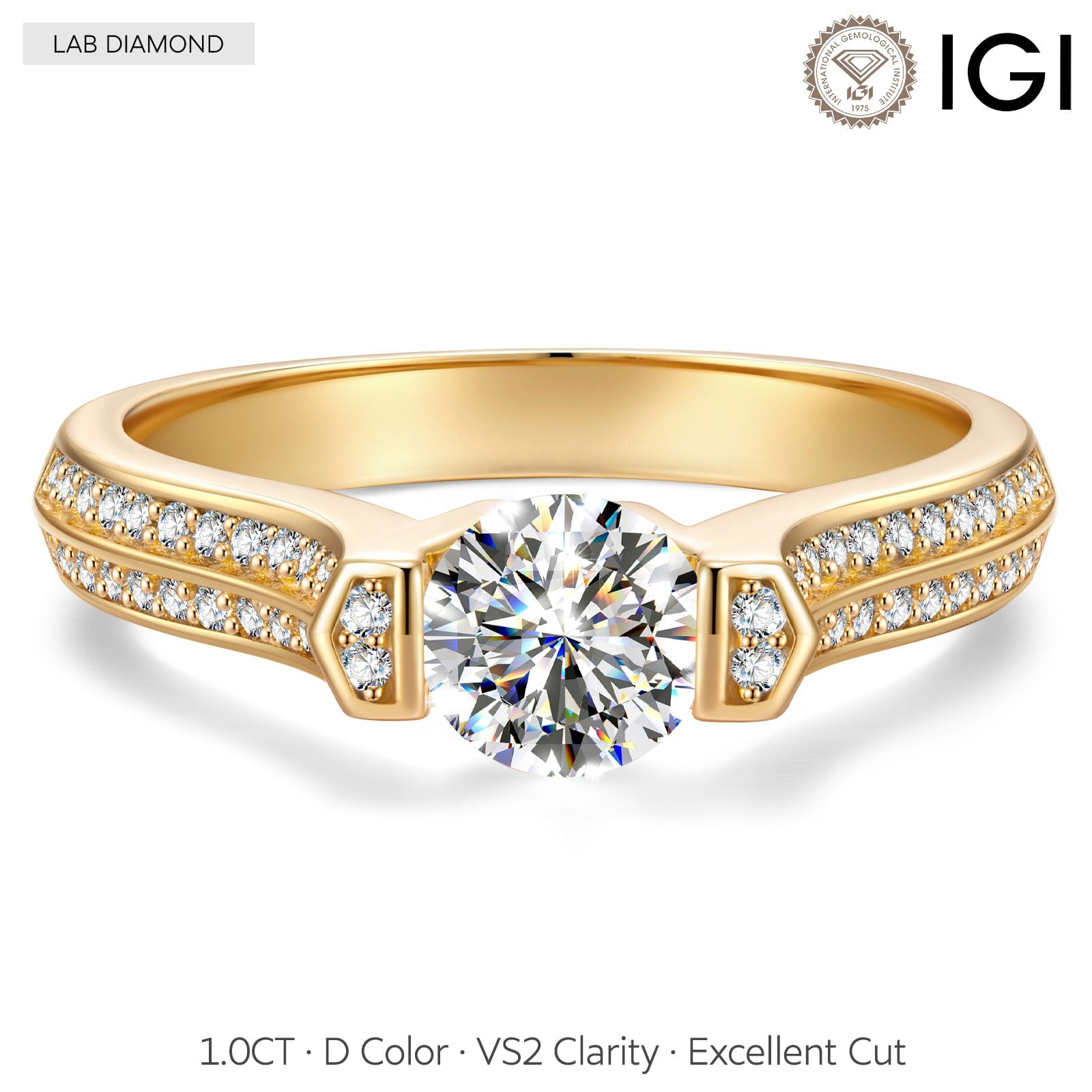 IGI Certified Lab-Grown Round Brilliant Cut Diamond - Pave Classic Engagement Ring 14K Yellow Gold Plated (Includes IGI Certification from International Gemological Institute)