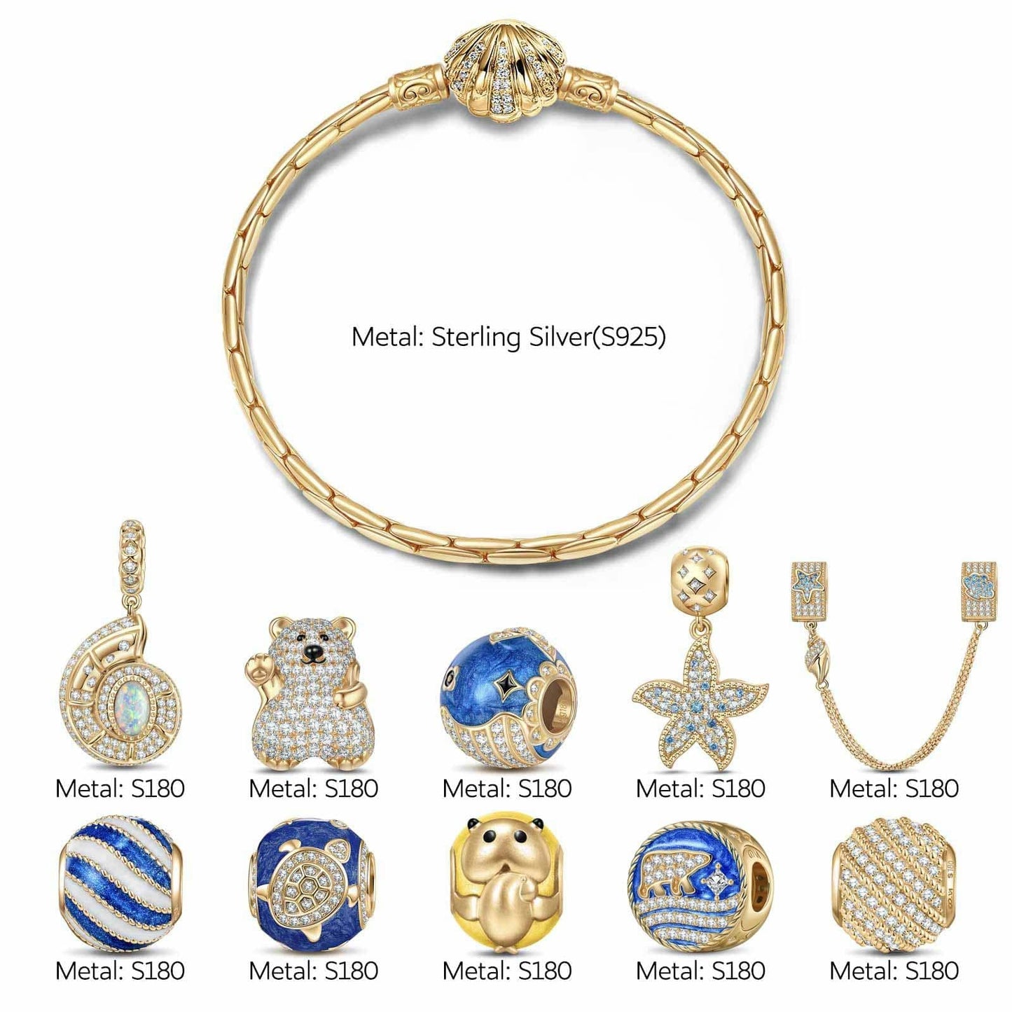 Design: Draws inspiration from the diverse marine life found in the depths of the sea and ocean culture. Each charm, whether it be a dolphin, a seashell, a mermaid, or a sailing vessel, carries the spirit of the sea and its inhabitants, inviting you to embrace the beauty and diversity of our marine ecosystem.