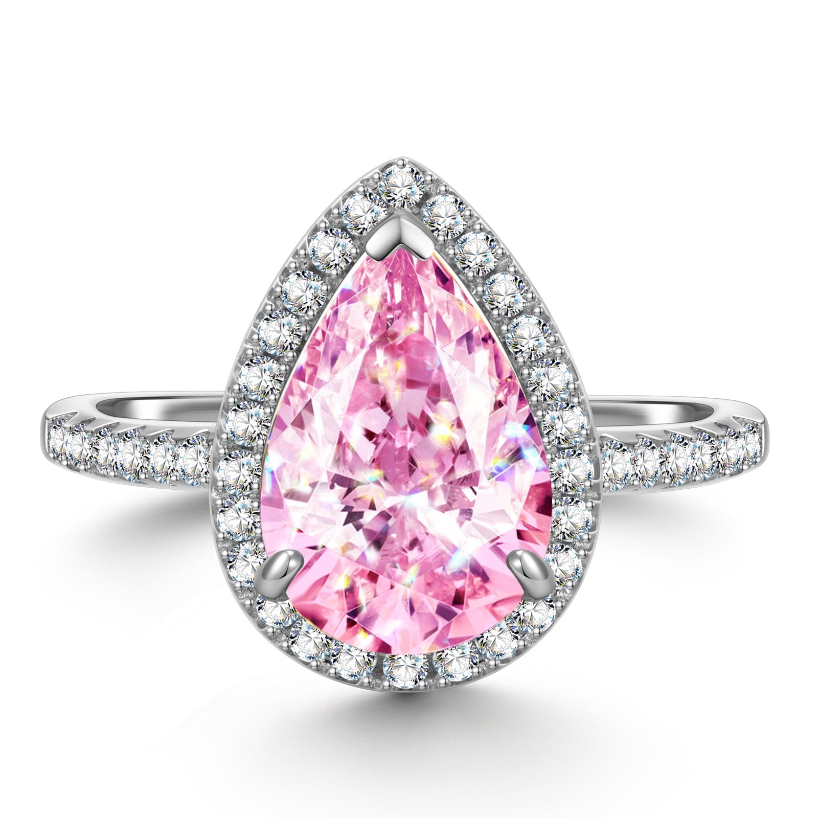 8*12mm Pear Modified Brilliant Cut Fancy Vivid Pink Ice-Frosted Sparkle Lab Zircon - Halo Classic Engagement Ring White Gold Plated