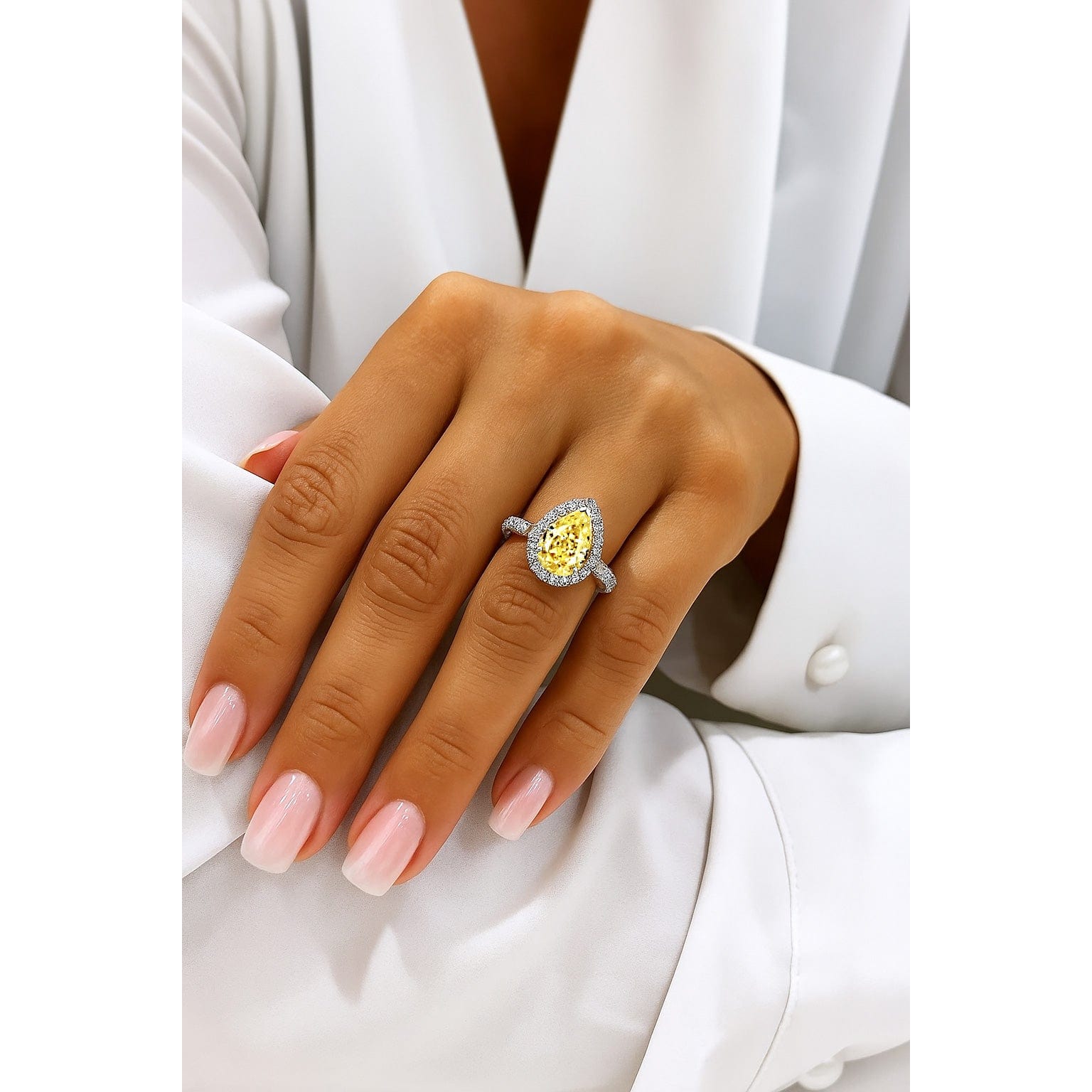 8*12mm Pear Modified Brilliant Cut Fancy Vivid Yellow Ice-Frosted Sparkle Lab Zircon - Halo Classic Engagement Ring White Gold Plated