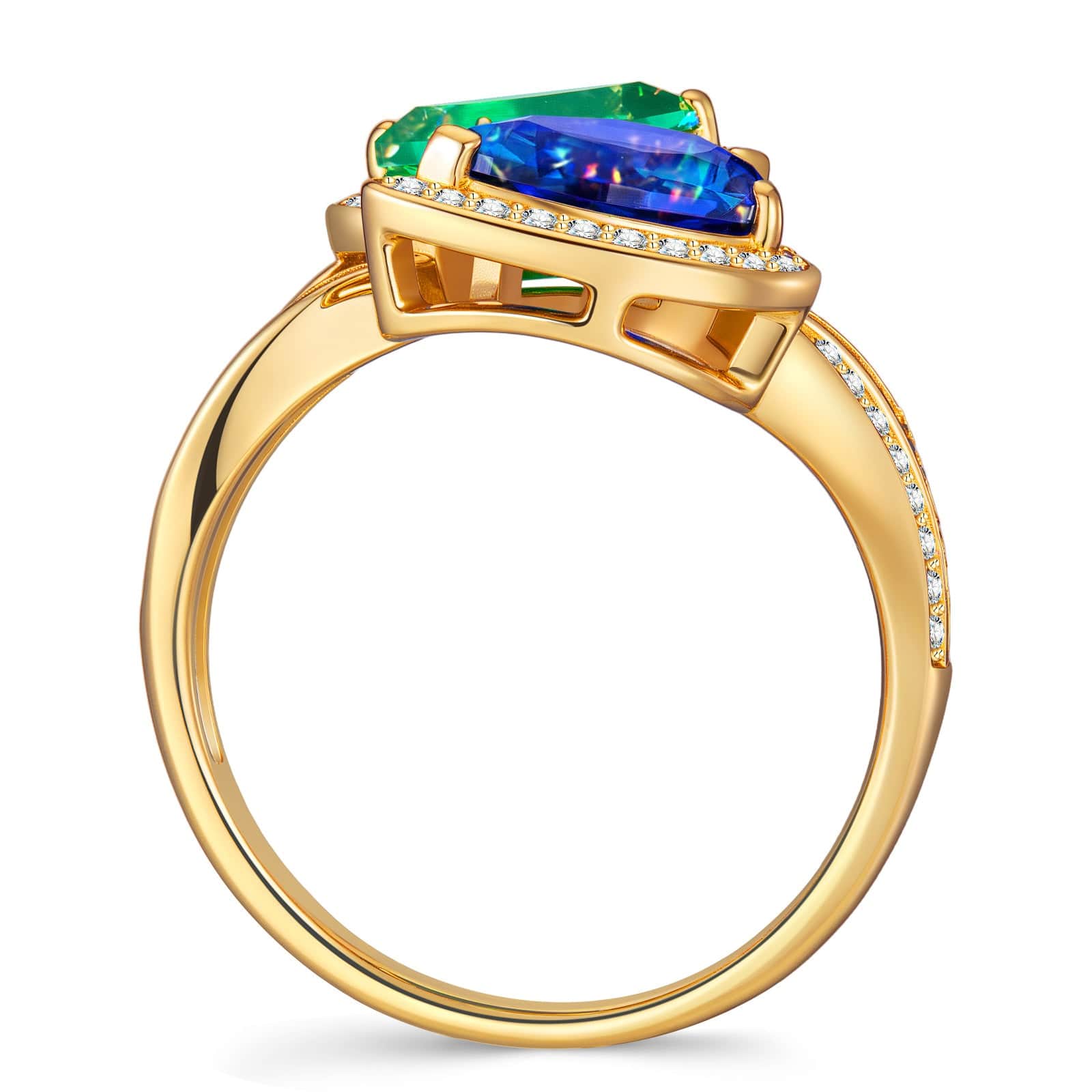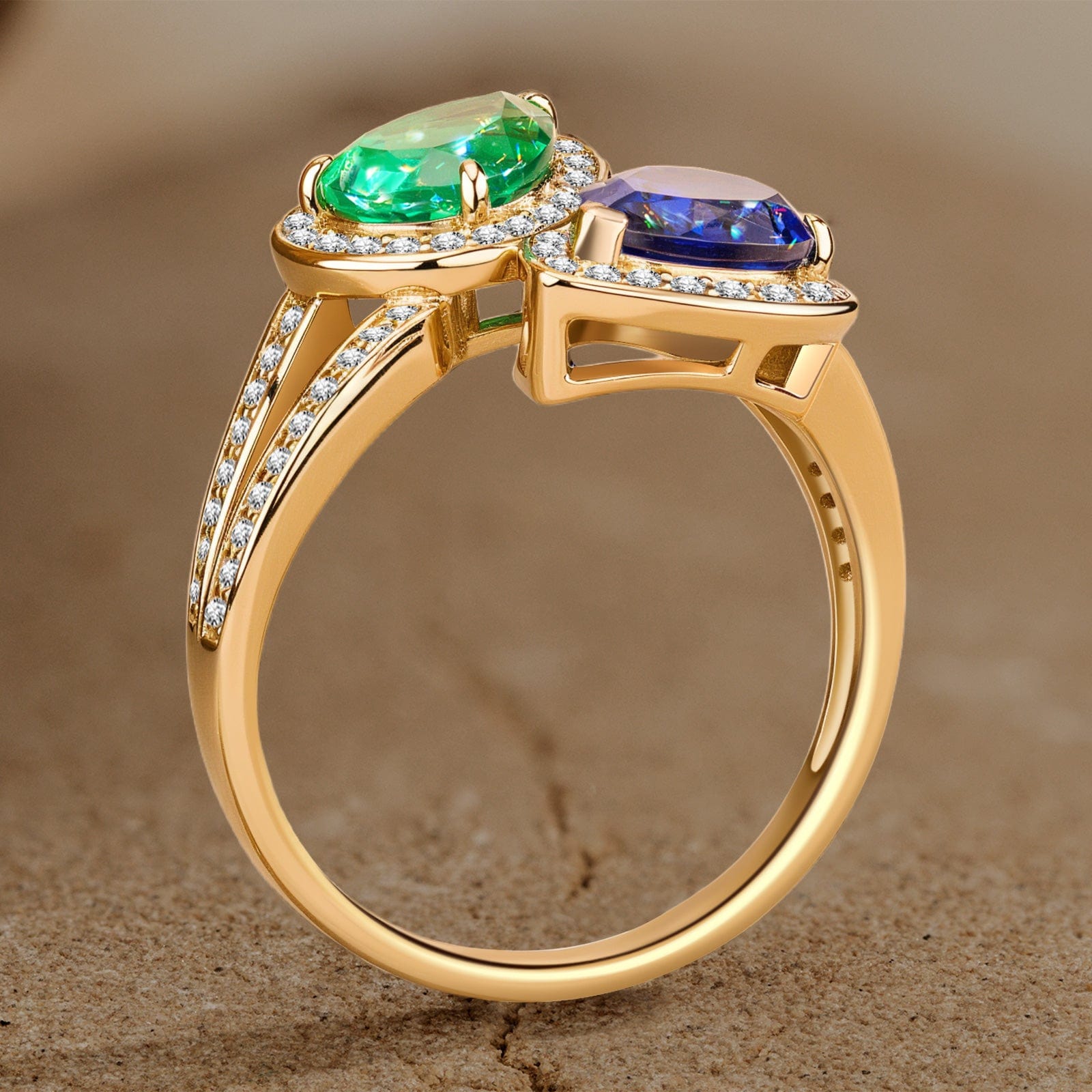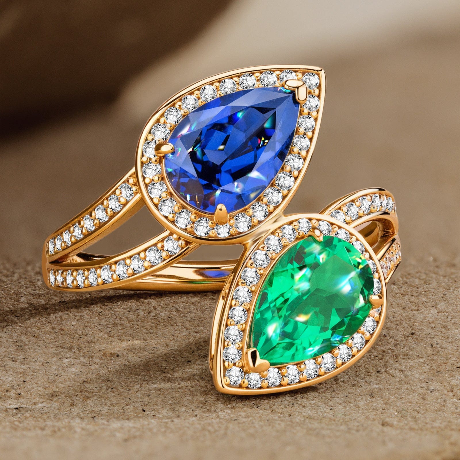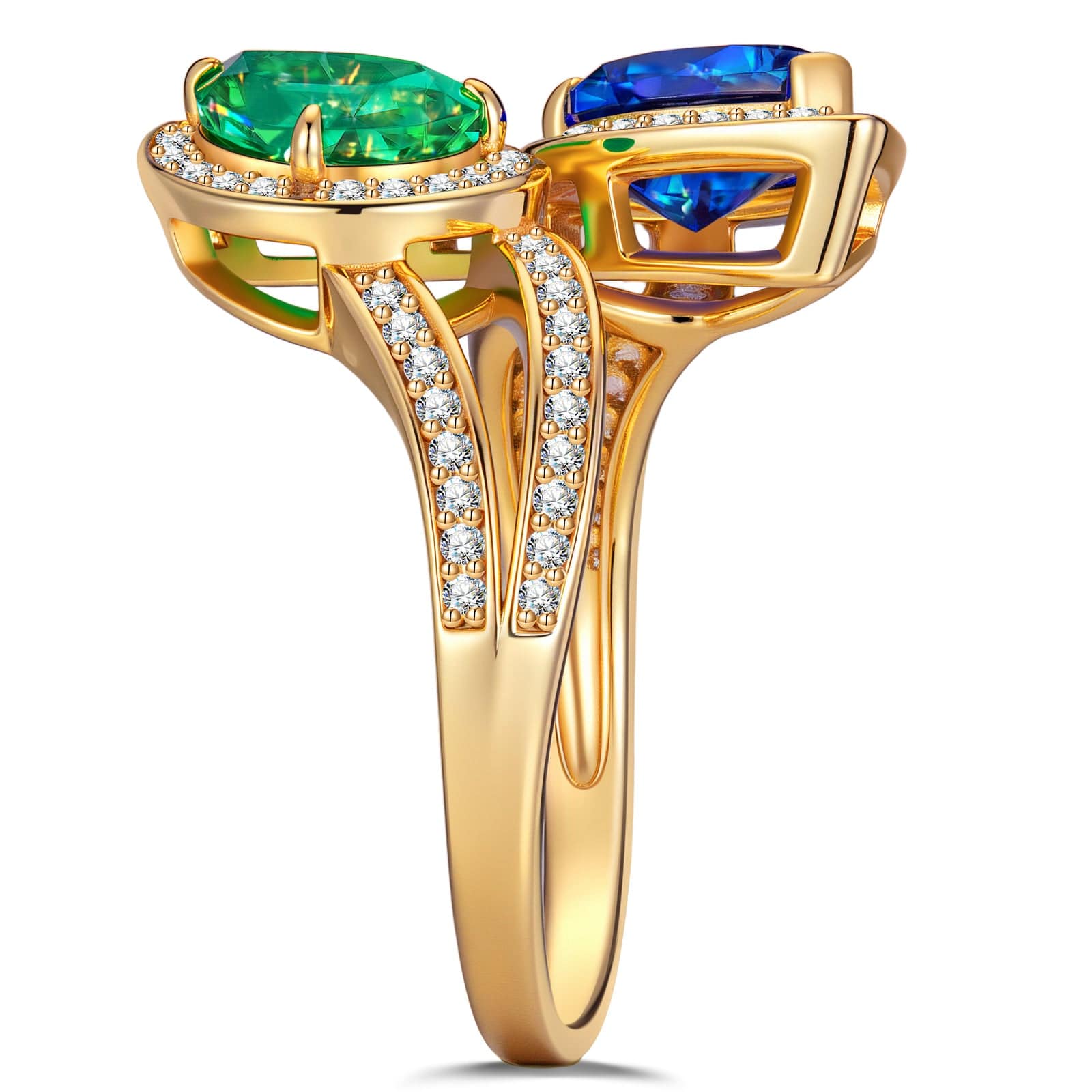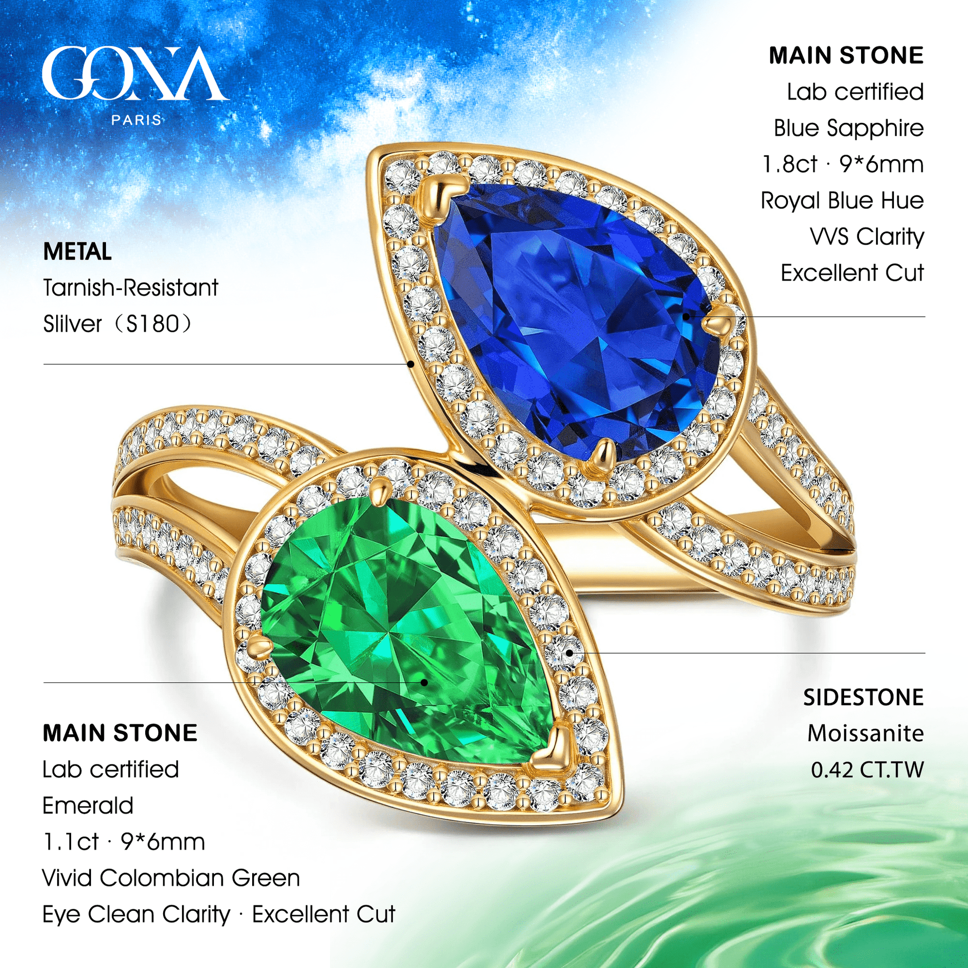 1.80 ct Lab-Grown Pear Brilliant Cut Blue Sapphire and 1.10 ct Lab-Grown Pear Brilliant Cut Emerald - Two Stone Classic Engagement Ring 14K Yellow Gold Plated (Includes GRC Certification from Gemstone Research Center)