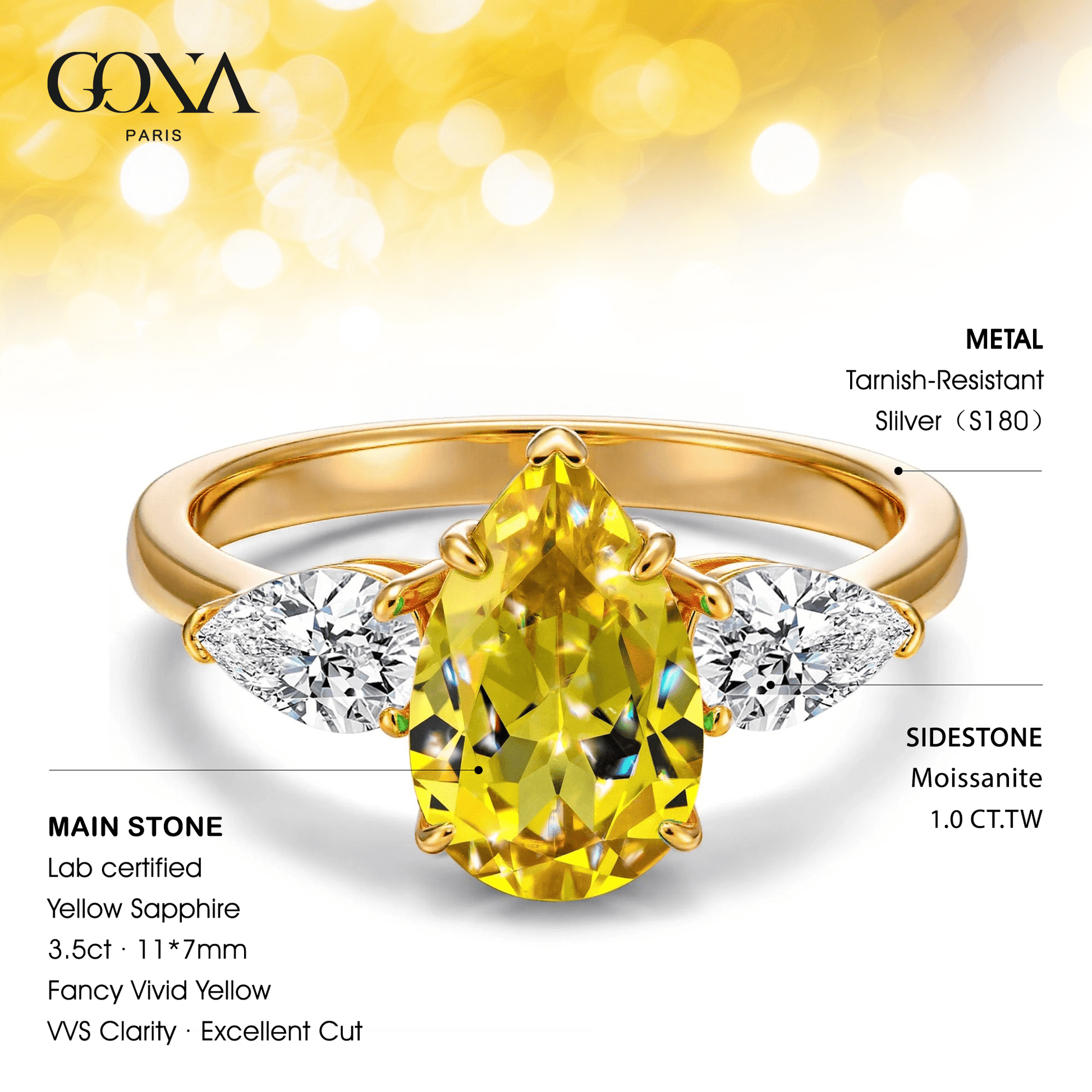 Pear Brilliant Cut Fancy Vivid Yellow Lab-certified Yellow Sapphire - Three Stone Classic Engagement Ring 14K Yellow Gold Plated (Includes GRC Certification from Gemstone Research Center)