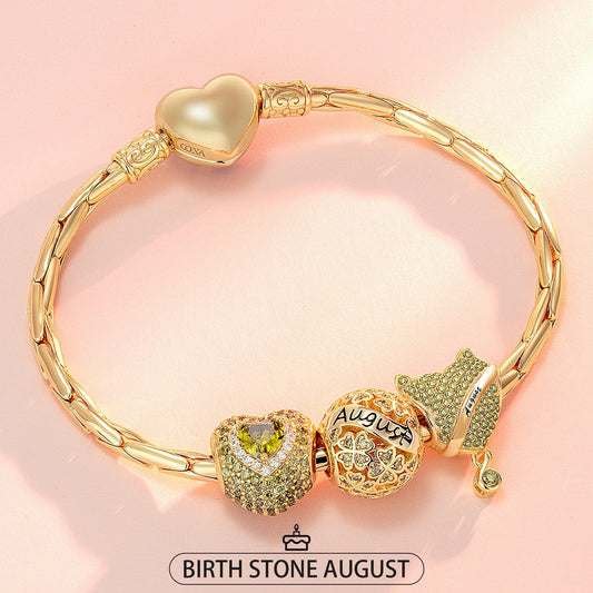 Sterling Silver August Birthday Stone Charms Bracelet Set In 14K Gold Plated (Includes bracelet and all charms shown)