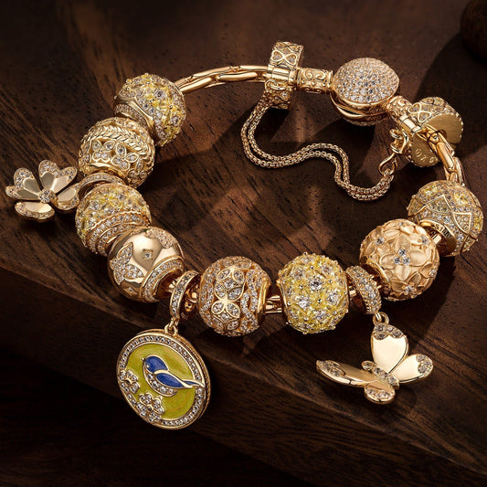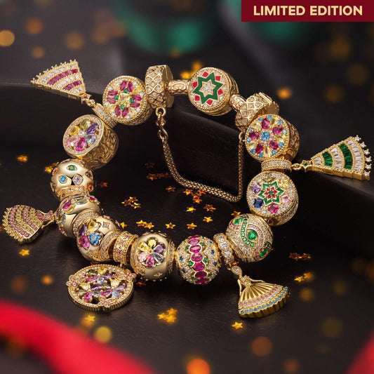 Sterling Silver Elegant Bliss Charms Bracelet Set With Enamel In 14K Gold Plated (Includes bracelet and all charms shown)