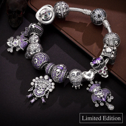 Limited Edition Flash Sale: Sterling Silver Shadowed Skull Kingdom Charms Bracelet Set With Enamel In White Gold Plated (Includes bracelet and all charms shown)
