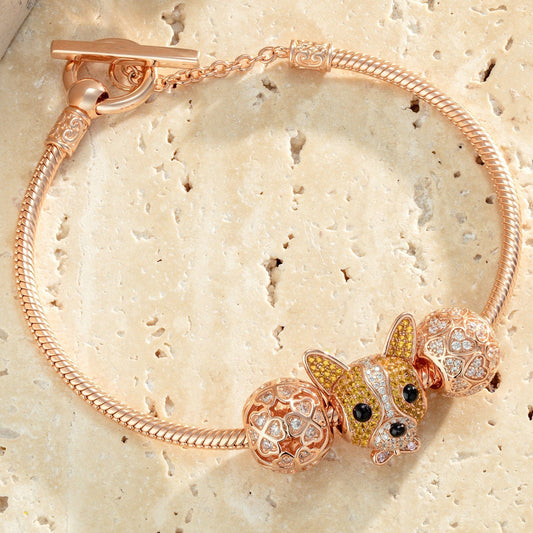 Lucky Corgi Tarnish-resistant Silver Charms Bracelet Set With Enamel In Rose Gold Plated (Includes bracelet and all charms shown)
