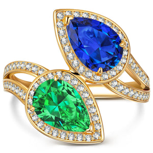 1.80 ct Lab-Grown Pear Brilliant Cut Blue Sapphire and 1.10 ct Lab-Grown Pear Brilliant Cut Emerald - Two Stone Classic Engagement Ring 14K Yellow Gold Plated (Includes GRC Certification from Gemstone Research Center)