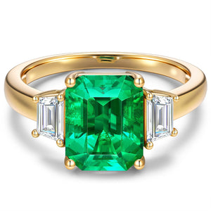 Emerald-Cut Vivid Colombian Green Lab-Certified Emerald - Three Stone Classic Engagement Ring 14K Yellow Gold Plated (Includes GRC Certification from Gemstone Research Center)
