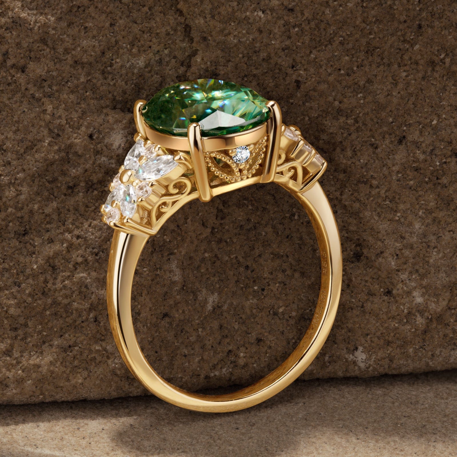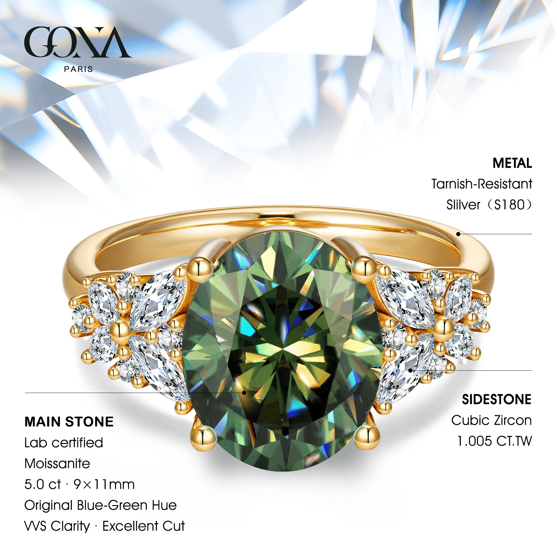 Oval Brilliant Cut Original Blue-Green Hue Lab-Certified Moissanite - Halo Classic Engagement Ring 14K Yellow Gold Plated (Includes GRA Certification from Gemological Research Association)