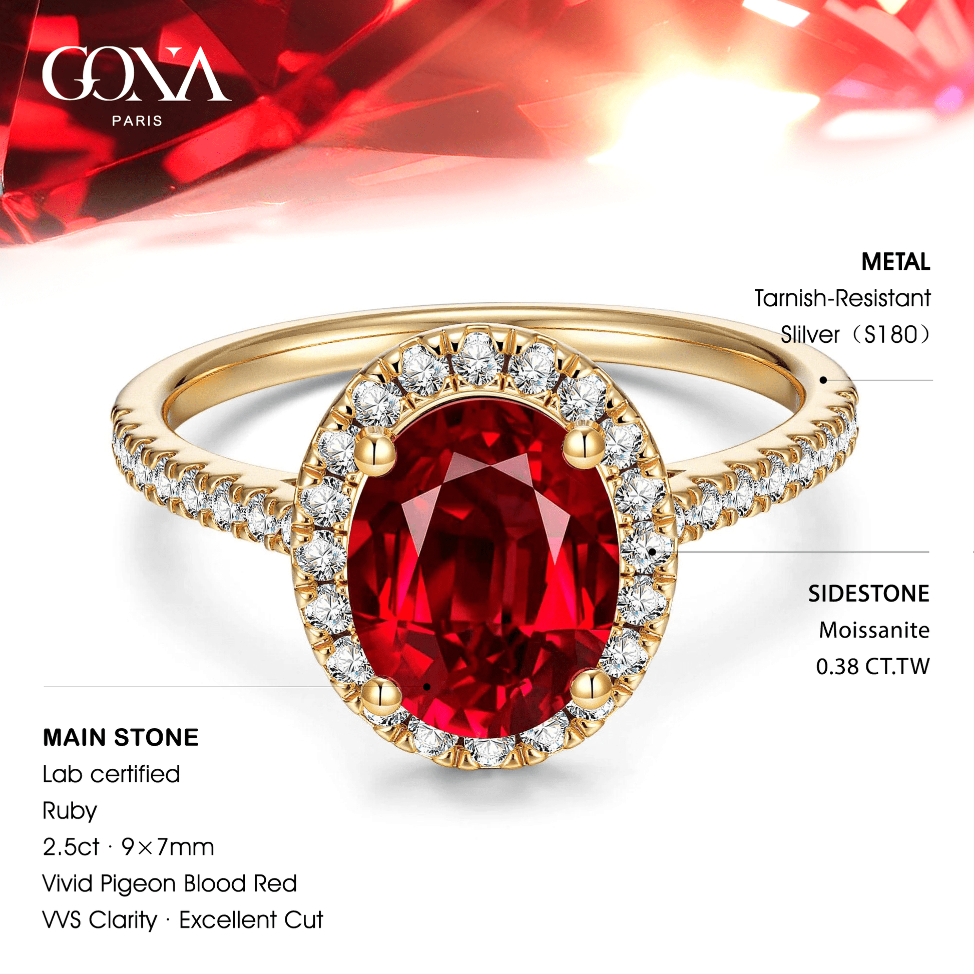Oval Brilliant Cut Vivid Pigeon Blood Red Lab-Certified Ruby - Halo Classic Engagement Ring 14K Yellow Gold Plated (Includes GRC Certification from Gemstone Research Center)
