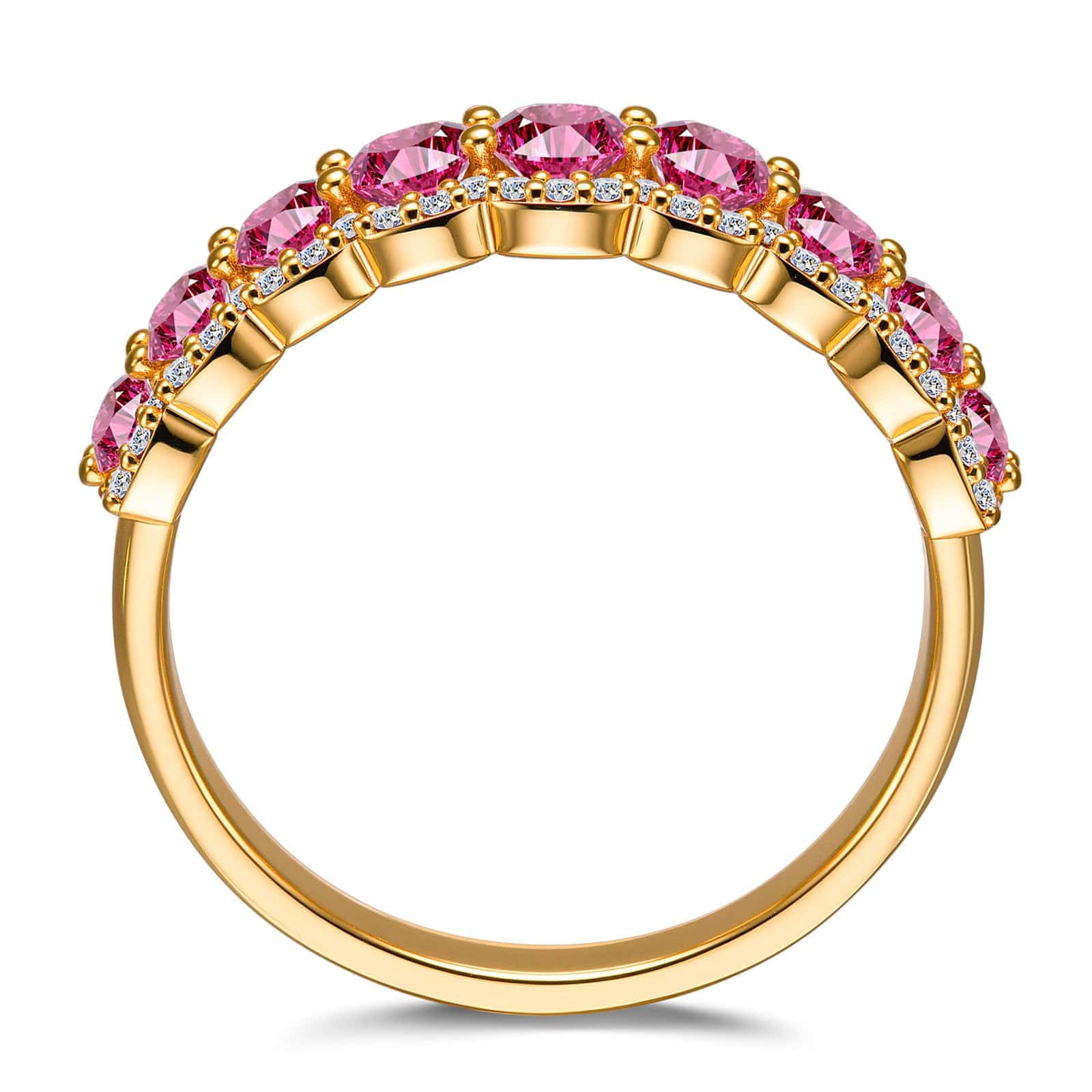 Round Brilliant Cut Fancy Vivid Rose Hue Lab-Certified Pink Sapphire - Half Eternity Ring 14K Yellow Gold Plated (Includes GRC Certification from Gemstone Research Center)